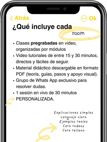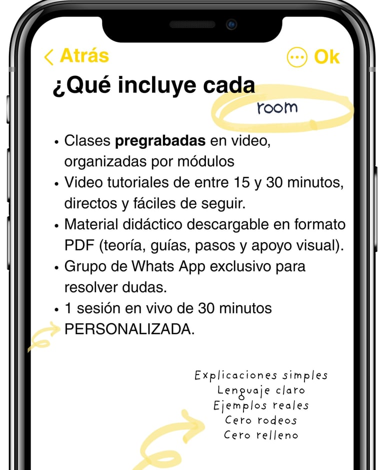 Todos los Rooms son 100% en línea con clases pregrabadas, para que puedas avanzar a tu propio ritmo y repetir las lecciones las veces que necesites. PERO SÍ tienes una sesión en vivo de 30 minutos para resolver dudas al final del curso.